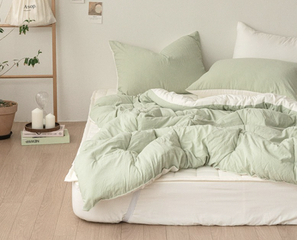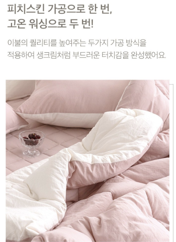 이불에서 가장 중요한 건 바로 촉감이죠. 쉐이크밀크 워싱 가공으로 마치 오래 사용한 듯 부드럽고 자연스러운 터치감을 느낄 수 있습니다. 피부에 닿는 순간 거슬림이 없고, 민감한 피부에도 안심하고 사용할 수 있는 게 장점이에요.