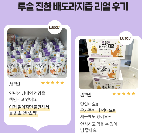 이 두 가지가 만나 맛과 건강을 모두 챙길 수 있는 배도라지즙이 되었답니다. 인공첨가물 없이 진하게 우려내서 남녀노소 누구나 안심하고 마실 수 있어요.