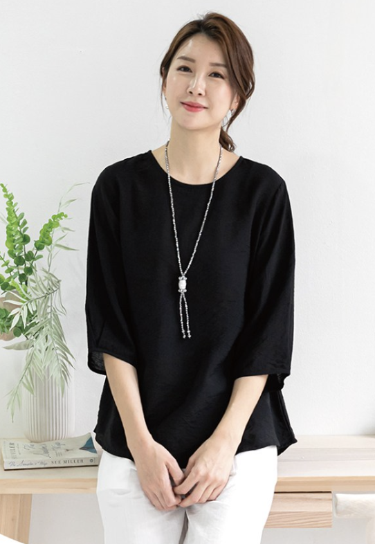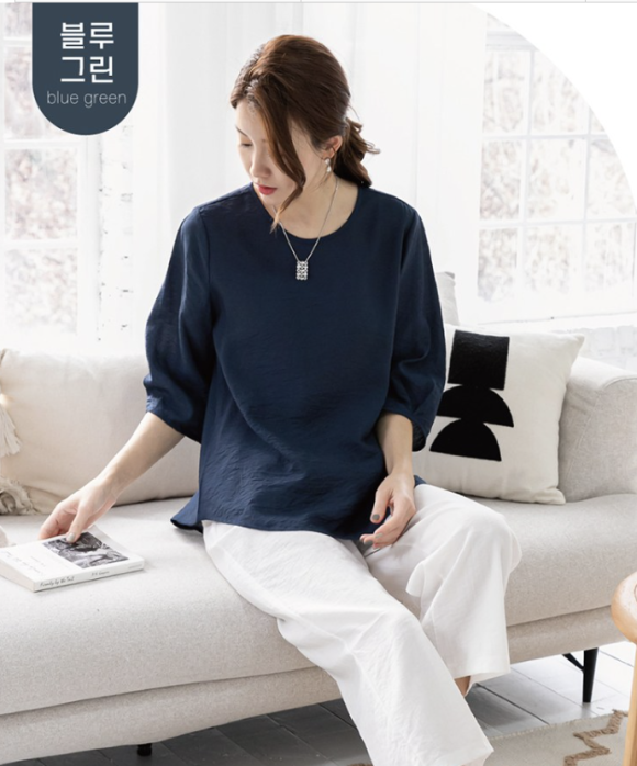 오늘 소개할 아이템은 바로 여성용 인견 7부소매 단색 블라우스, 흔히 사랑받는 셔링 블라우스라고 불리는 제품입니다.