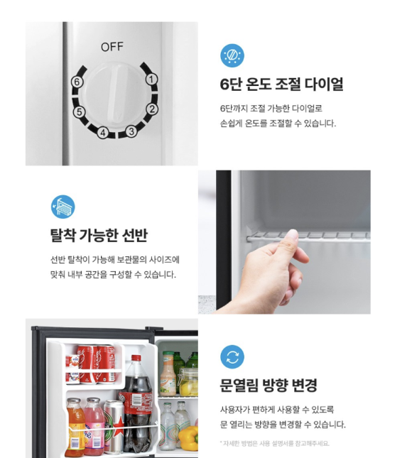 마이디어 44L 냉장고는 소형이지만 꽤 알찬 수납 공간을 제공합니다. 일반적인 1인 가구의 음료, 간단한 식재료, 즉석식품을 넣기에 충분한 용량이고, 내부 선반이 조절 가능해 다양한 크기의 용기와 음료를 효율적으로 수납할 수 있습니다.