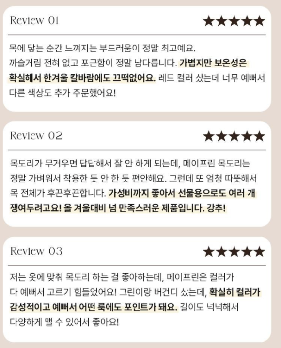 가격대도 부담이 적고 누구나 일상에서 사용할 수 있는 겨울 필수템이라 선물용으로도 좋은 선택입니다. 포근한 소재와 깔끔한 외형 덕분에 받는 사람의 취향을 크게 타지 않는 편이며, 실용성과 활용도를 동시에 챙길 수 있습니다.