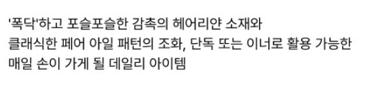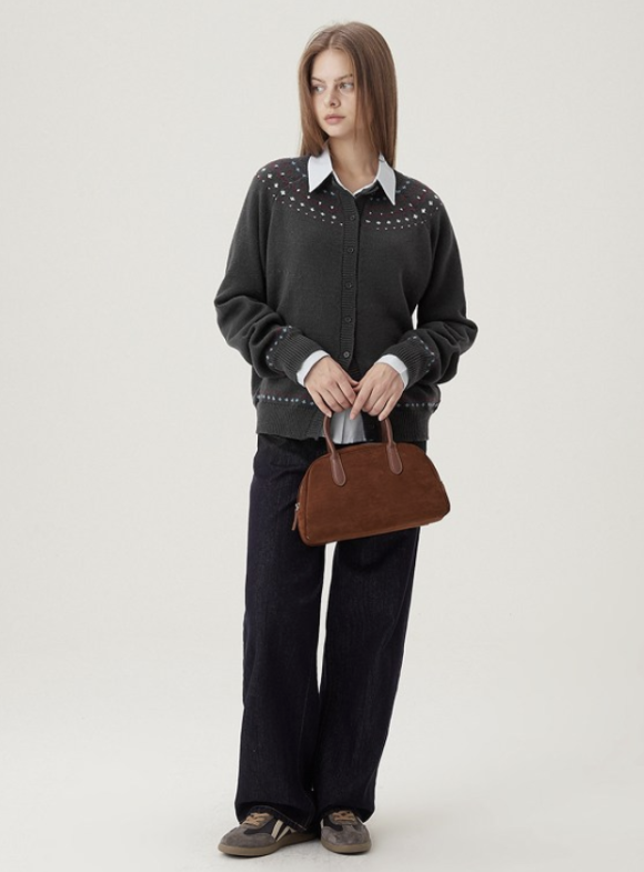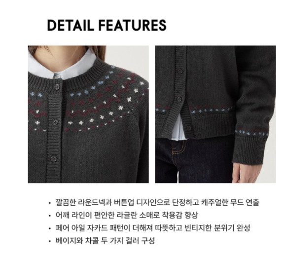 가디건에 포인트가 되어주는 페어 아일 자카드 패턴은 겨울 아이템에서만 느낄 수 있는 따뜻하고 빈티지한 감성을 담고 있습니다. 폭닥한 헤어리얀 소재와 조화롭게 어우러져 부드럽고 포근한 분위기를 연출하며, 과하지 않은 패턴이라 다양한 코디에 자연스럽게 매칭됩니다.