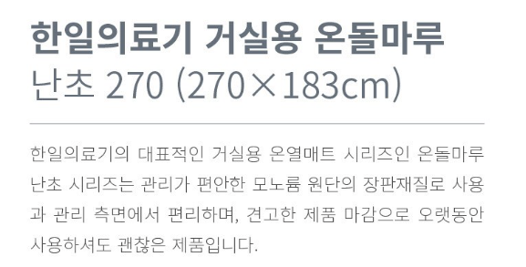 HanilMedical은 전기요와 전기매트 제품군으로 잘 알려진 브랜드다. 가정용 전기 난방 제품을 중심으로 다양한 라인업을 선보이고 있으며, 온돌마루 전기매트 난초 역시 일상적인 사용 환경을 고려한 제품 구성에 초점을 맞춘 모델이다.