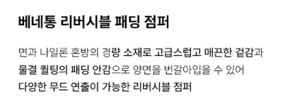 베네통스포츠 25FW 리버시블 패딩점퍼는 활용도 중심의 아우터를 고민하는 경우 참고해볼 수 있는 구성으로 볼 수 있다.