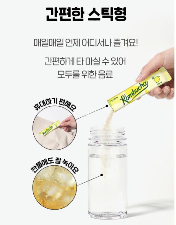 그중에서도 티젠 콤부차 레몬은 상큼한 맛과 간편함 덕분에 많은 분들이 찾는 제품이에요. 🍋✨