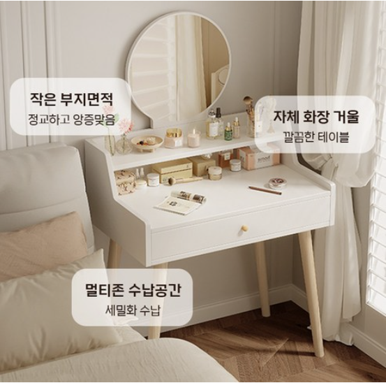 공간을 많이 차지하지 않으면서도 기본적인 화장대 기능은 충분히 갖추고 있어, 원룸이나 좁은 드레스룸을 사용하는 분들께 적합합니다.
