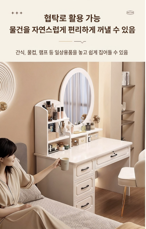하나의 가구로 화장대 + 수납장 + 책상 기능을 모두 사용할 수 있어 공간 효율이 높습니다.
