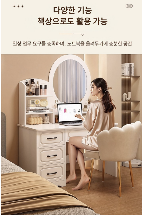 이 제품은 단순한 화장대뿐 아니라 책상처럼 활용할 수 있는 멀티 가구입니다.