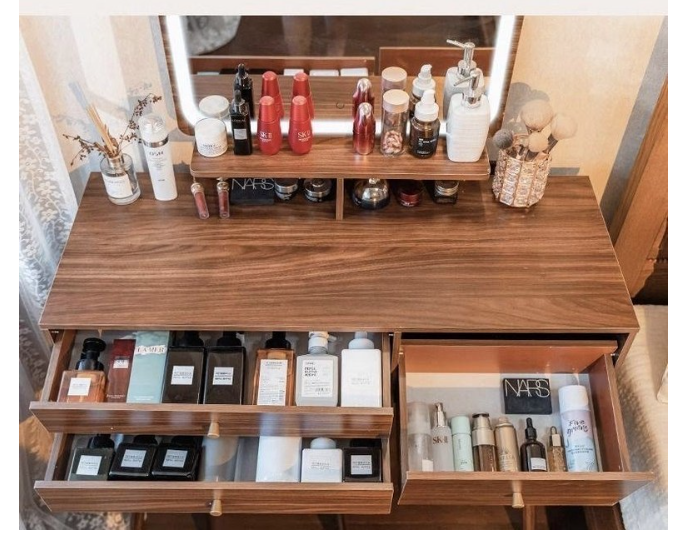 화장품, 뷰티 도구, 액세서리 등을 효율적으로 정리할 수 있는 수납 공간이 구성되어 있습니다.